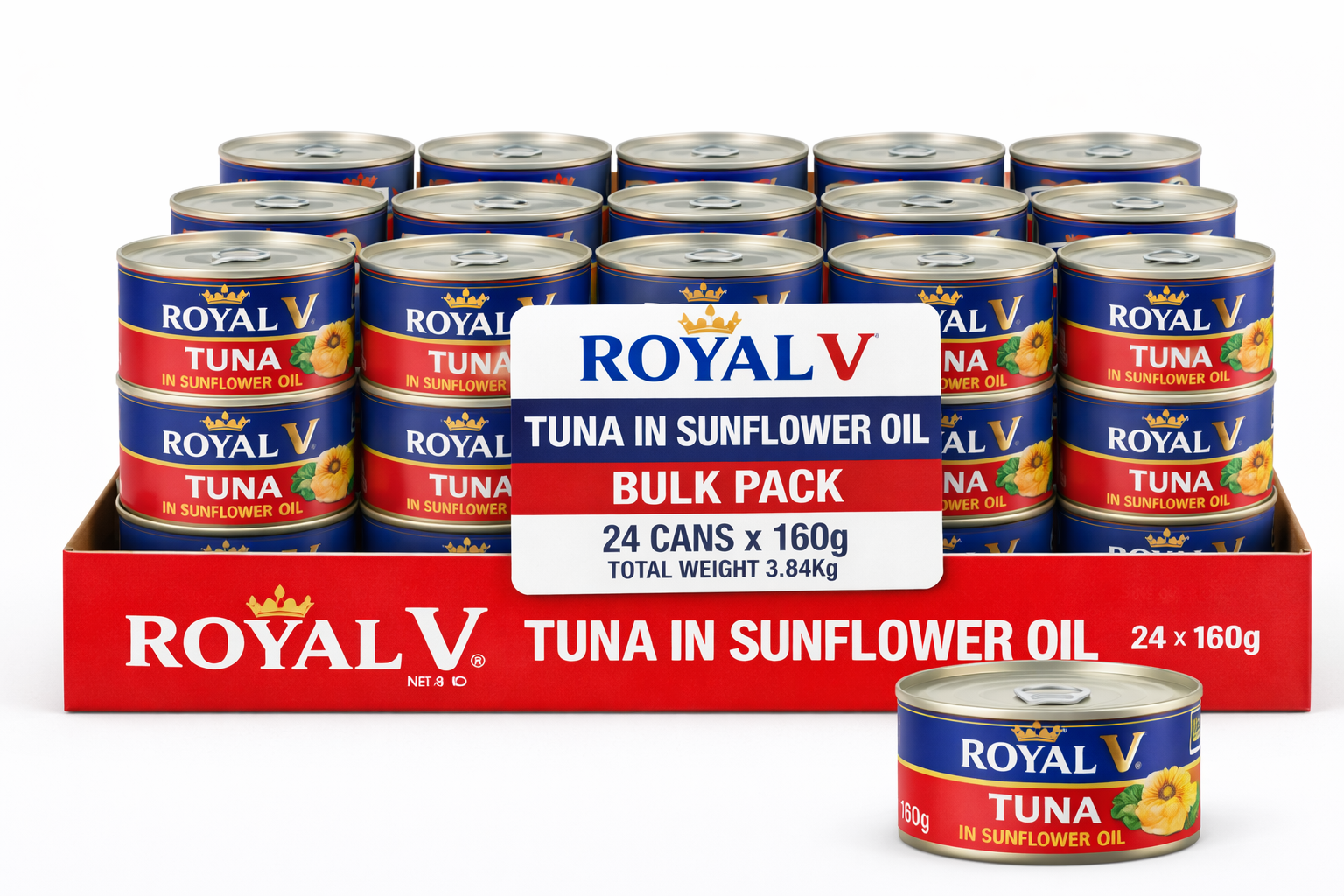 High-quality Royal V Tuna in Sunflower Oil, packed for rich flavour and freshness. Supplied in 160g cans, packed in a box of 48, ideal for households, restaurants, and retailers.