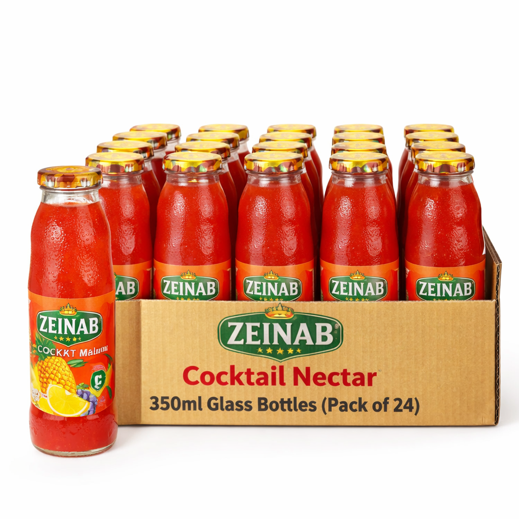 Zeinab Cocktail Nectar is a vibrant mixed fruit drink made from a blend of carefully selected fruits, offering a smooth and refreshing taste. Its balanced sweetness and fruity aroma make it a popular choice for both everyday refreshment and special occasions.